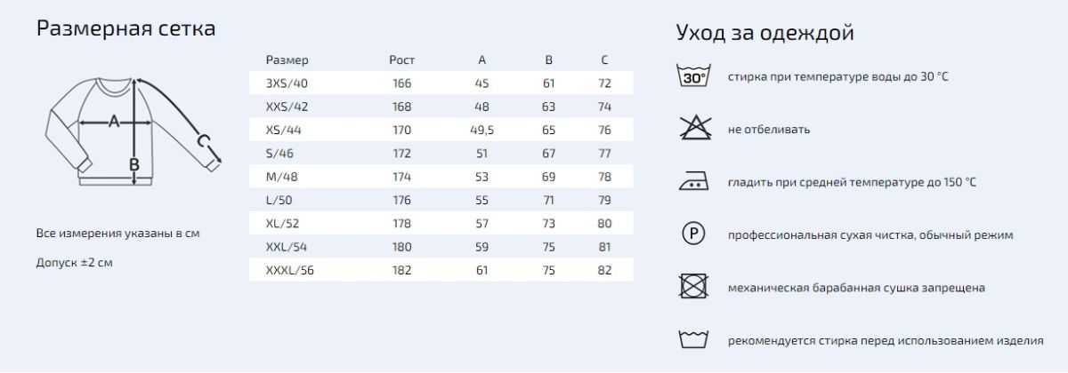 Рукава реглан, ворот, манжеты и пояс из эластичной резинки.